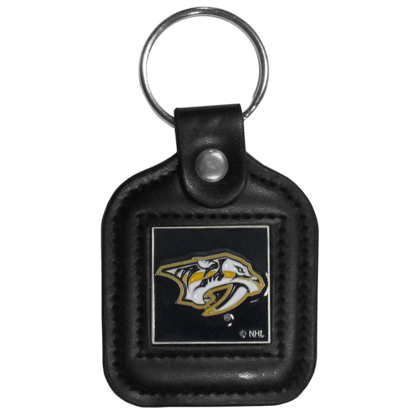 Our Nashville Predators® black key fob with stitched detail and inlaid, metal team emblem with enameled color details.