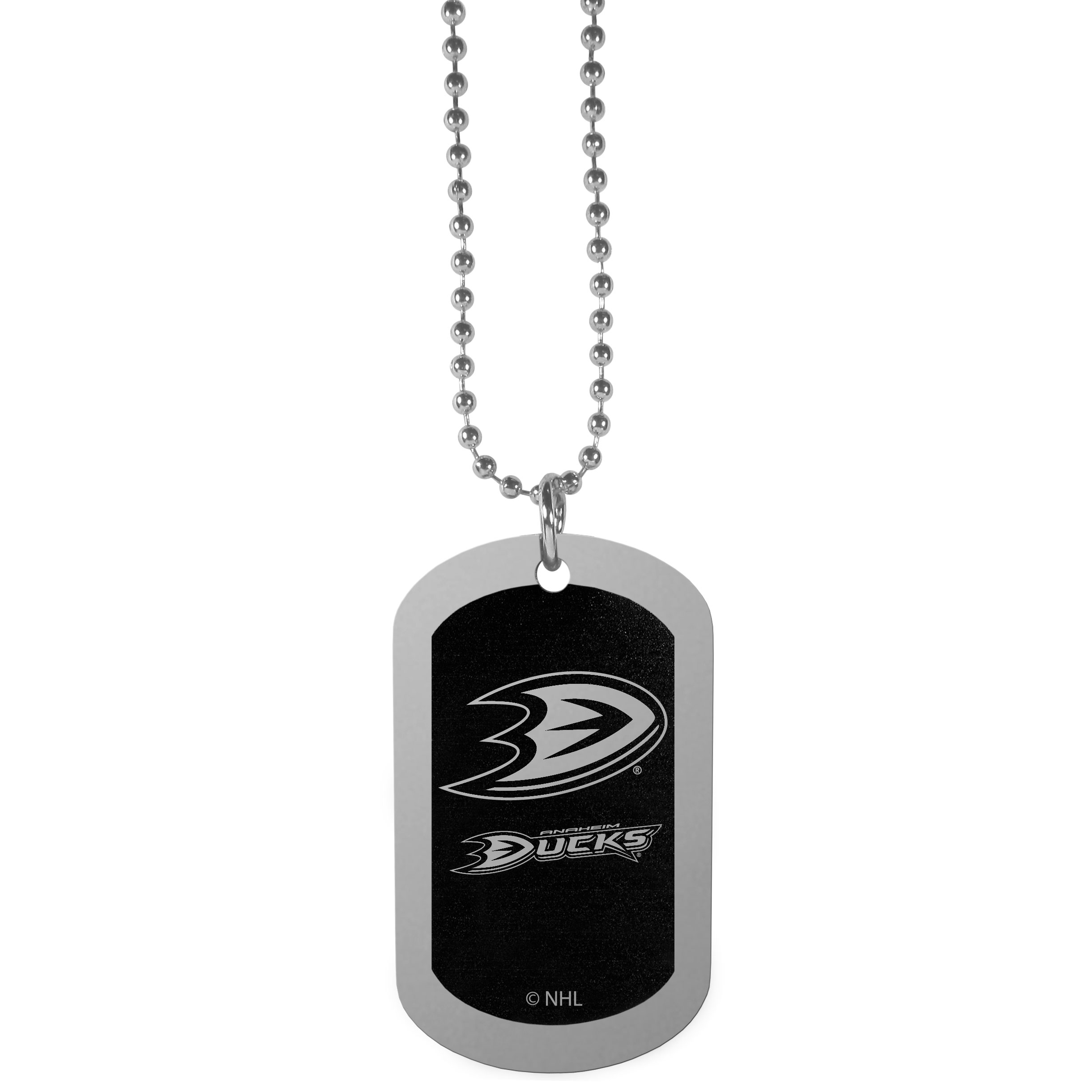 Dog tag necklaces are a fashion statement that is here to stay. The sporty version of the classic tag features a black printed over a high polish tag to create a bold and sporty look. The tag comes on a 26 inch ball chain with a ball and joint clasp. Any Anaheim Ducks® would be proud to wear this attractive fashion accessory.