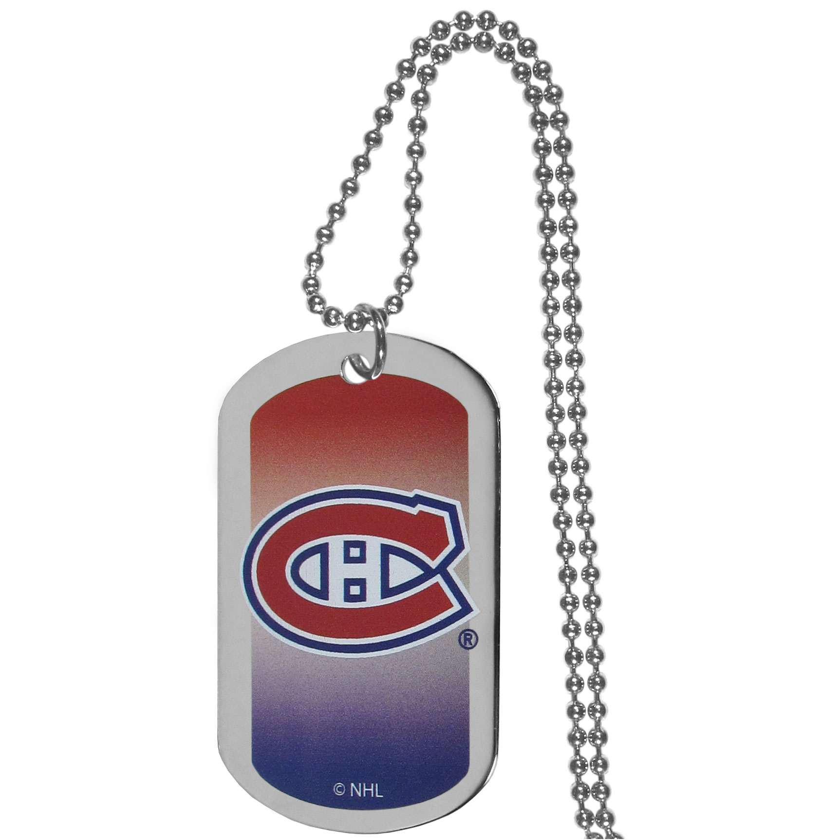 Dog tag necklaces are a fashion statement that is here to stay. The sporty version of the classic tag features a gradient print in team colors featuring a full color team logo over a high polish tag to create a bold and sporty look. The tag comes on a 26 inch ball chain with a ball and joint clasp. Any Montreal Canadiens® would be proud to wear this attractive fashion accessory.