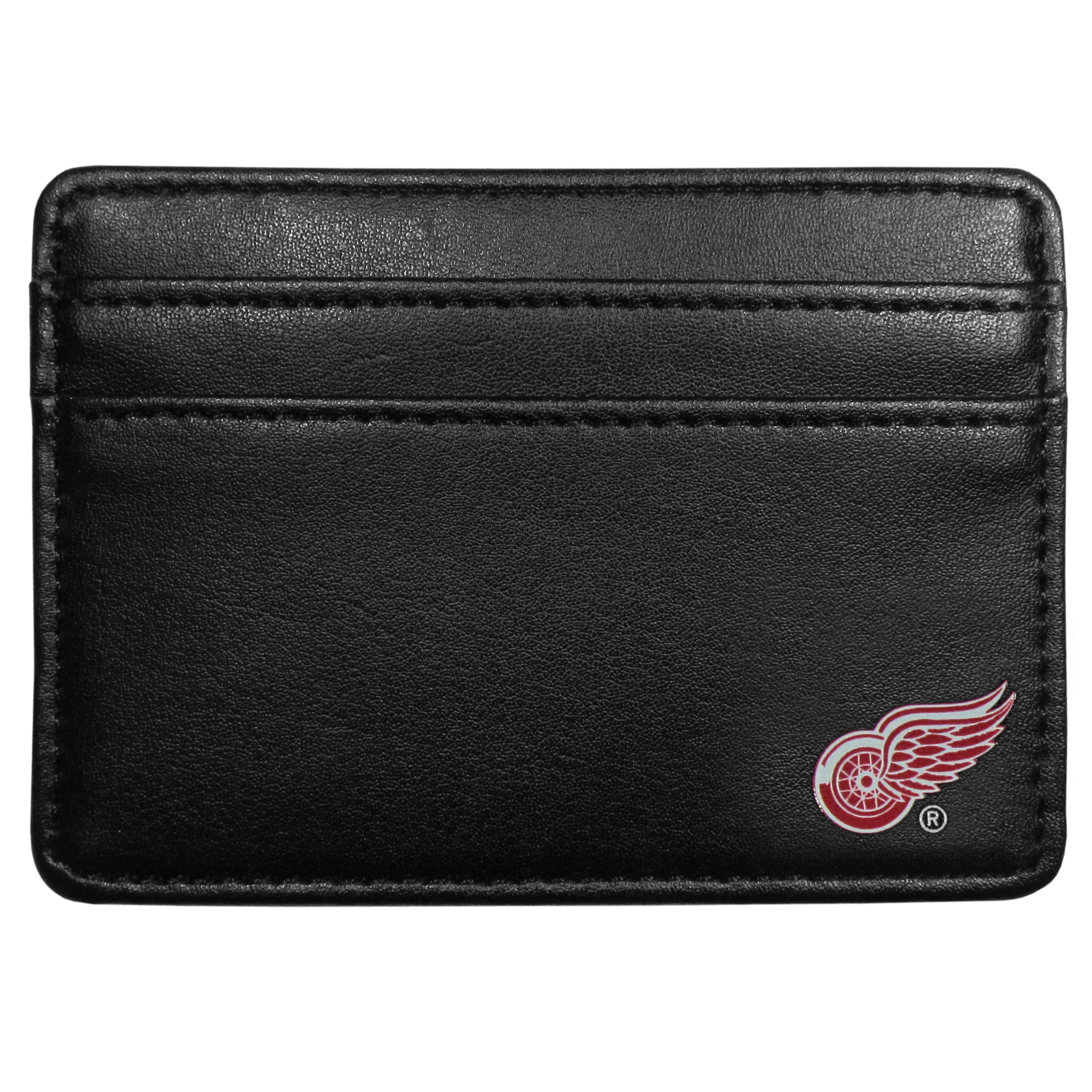 Ditch your bulky wallet! This super slim leather wallet is the perfect weekend companion and sports fan accessory. The compact design features 2 credit card slots on the front and one on the back and an inner middle pocket for cash. The front of the wallet has a crisp silk screened Detroit Red Wings® team logo. This front pocket wallet is just slightly larger than a credit card and super slim but with the inner pocket and outer slots it still can hold everything that you need.