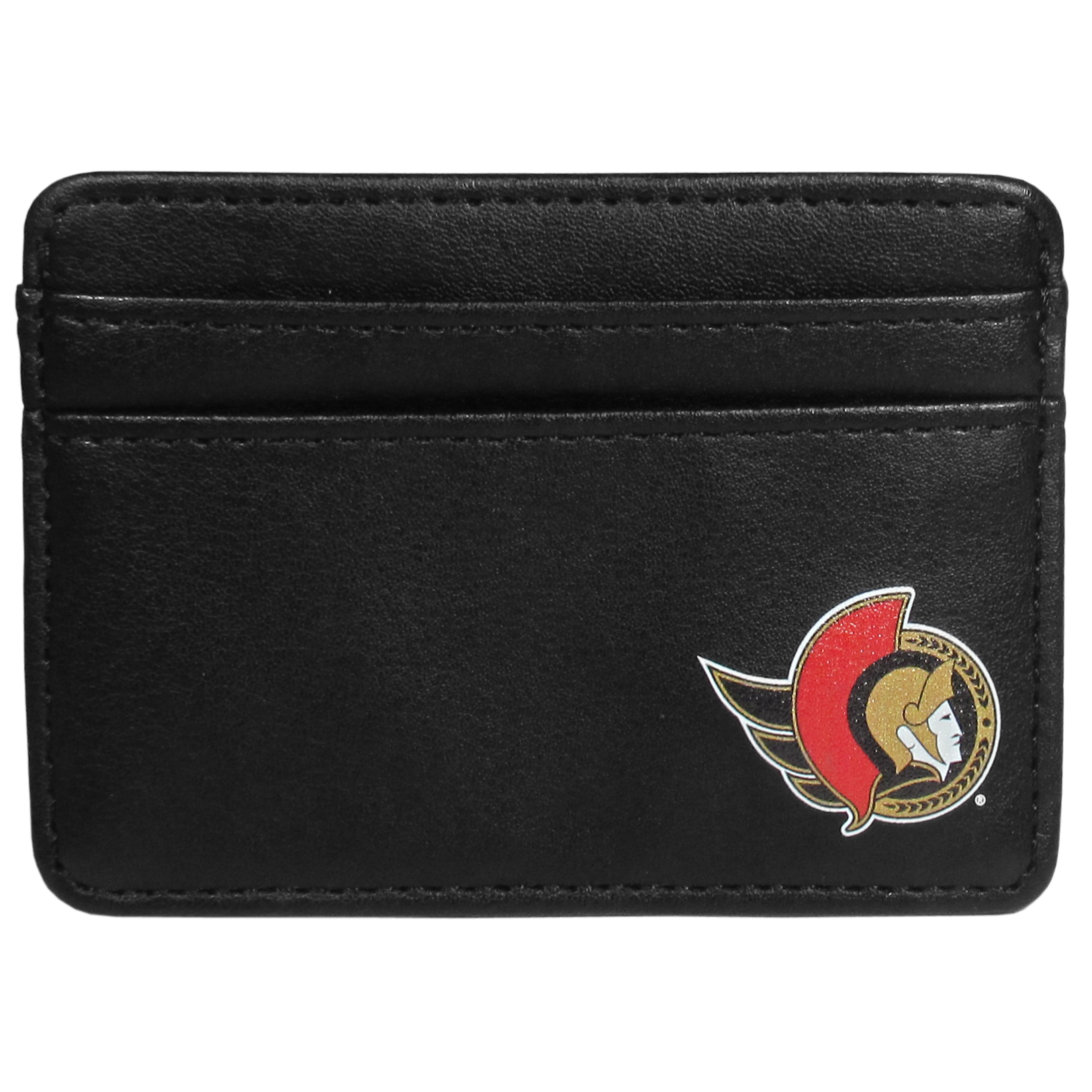 Ditch your bulky wallet! This super slim leather wallet is the perfect weekend companion and sports fan accessory. The compact design features 2 credit card slots on the front and one on the back and an inner middle pocket for cash. The front of the wallet has a crisp silk screened Ottawa Senators® team logo. This front pocket wallet is just slightly larger than a credit card and super slim but with the inner pocket and outer slots it still can hold everything that you need.
