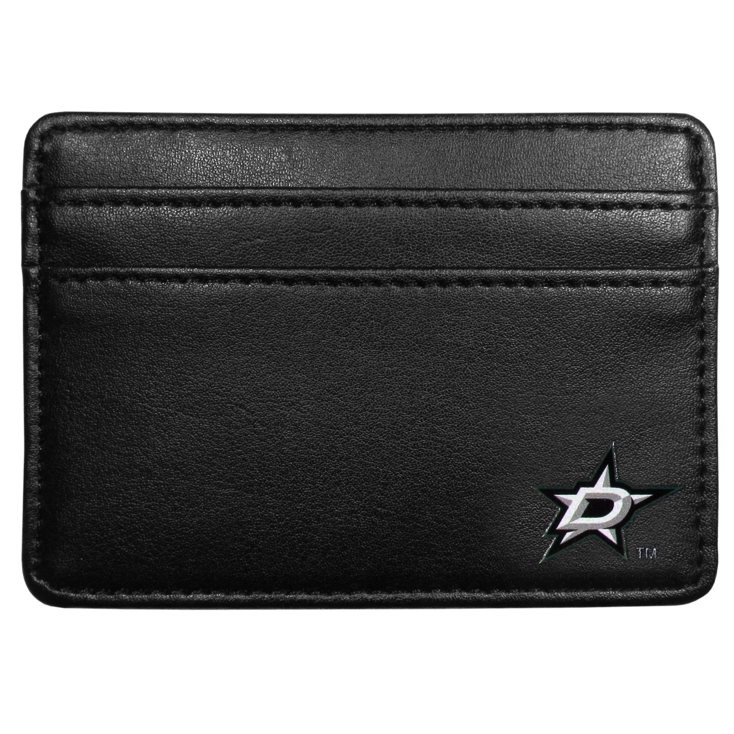 Ditch your bulky wallet! This super slim leather wallet is the perfect weekend companion and sports fan accessory. The compact design features 2 credit card slots on the front and one on the back and an inner middle pocket for cash. The front of the wallet has a crisp silk screened Dallas Stars™ team logo. This front pocket wallet is just slightly larger than a credit card and super slim but with the inner pocket and outer slots it still can hold everything that you need.