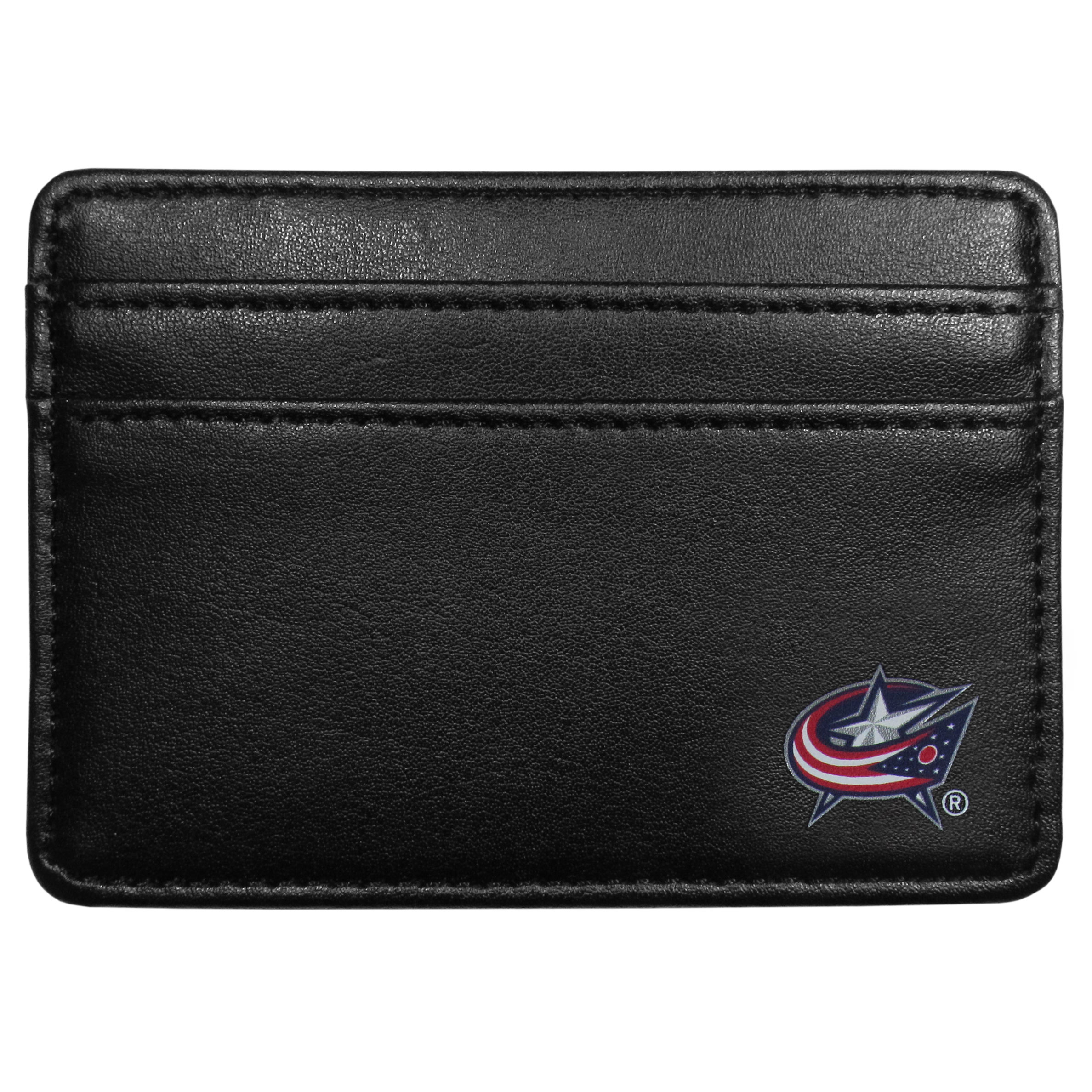 Ditch your bulky wallet! This super slim leather wallet is the perfect weekend companion and sports fan accessory. The compact design features 2 credit card slots on the front and one on the back and an inner middle pocket for cash. The front of the wallet has a crisp silk screened Columbus Blue Jackets® team logo. This front pocket wallet is just slightly larger than a credit card and super slim but with the inner pocket and outer slots it still can hold everything that you need.
