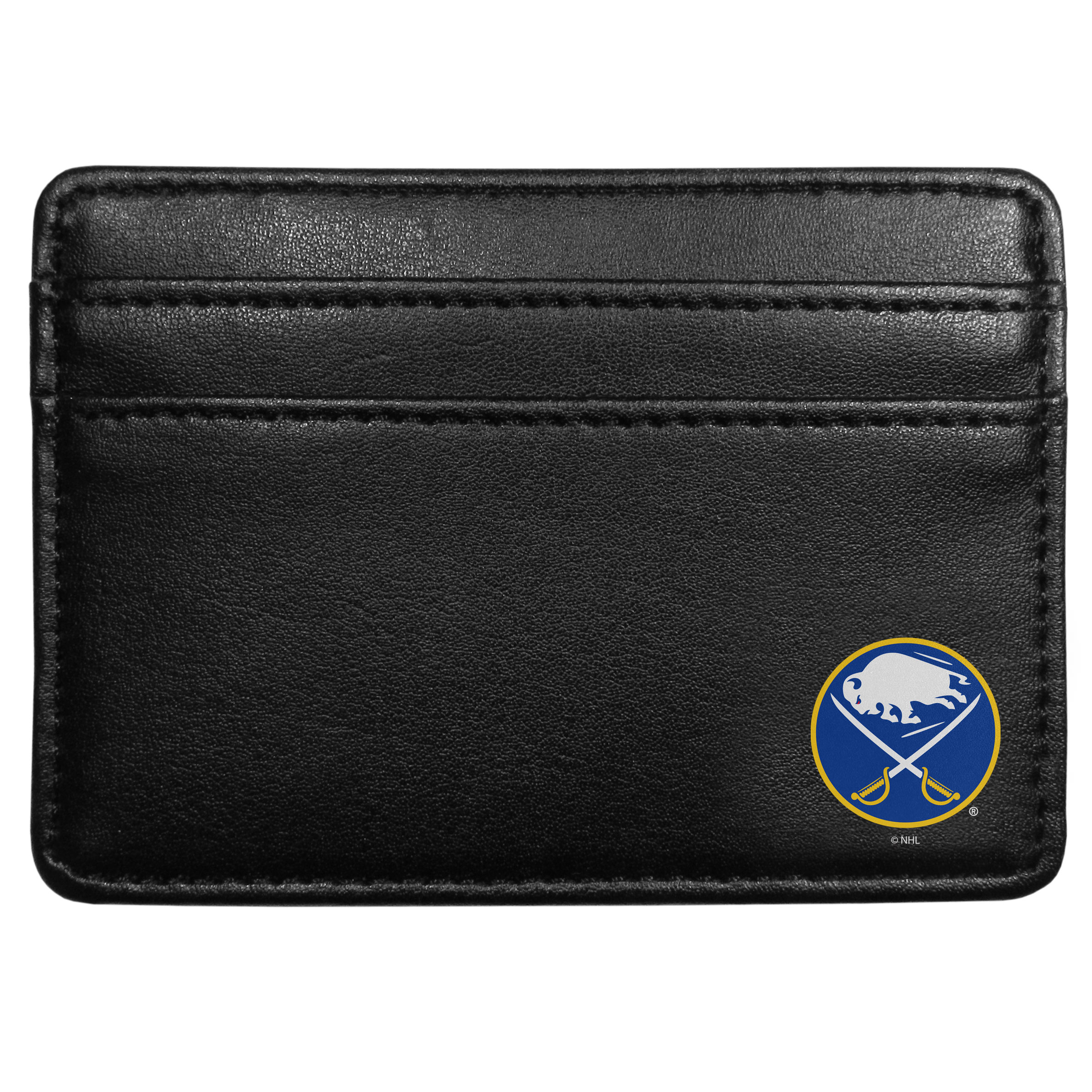 Ditch your bulky wallet! This super slim leather wallet is the perfect weekend companion and sports fan accessory. The compact design features 2 credit card slots on the front and one on the back and an inner middle pocket for cash. The front of the wallet has a crisp silk screened Buffalo Sabres® team logo. This front pocket wallet is just slightly larger than a credit card and super slim but with the inner pocket and outer slots it still can hold everything that you need.