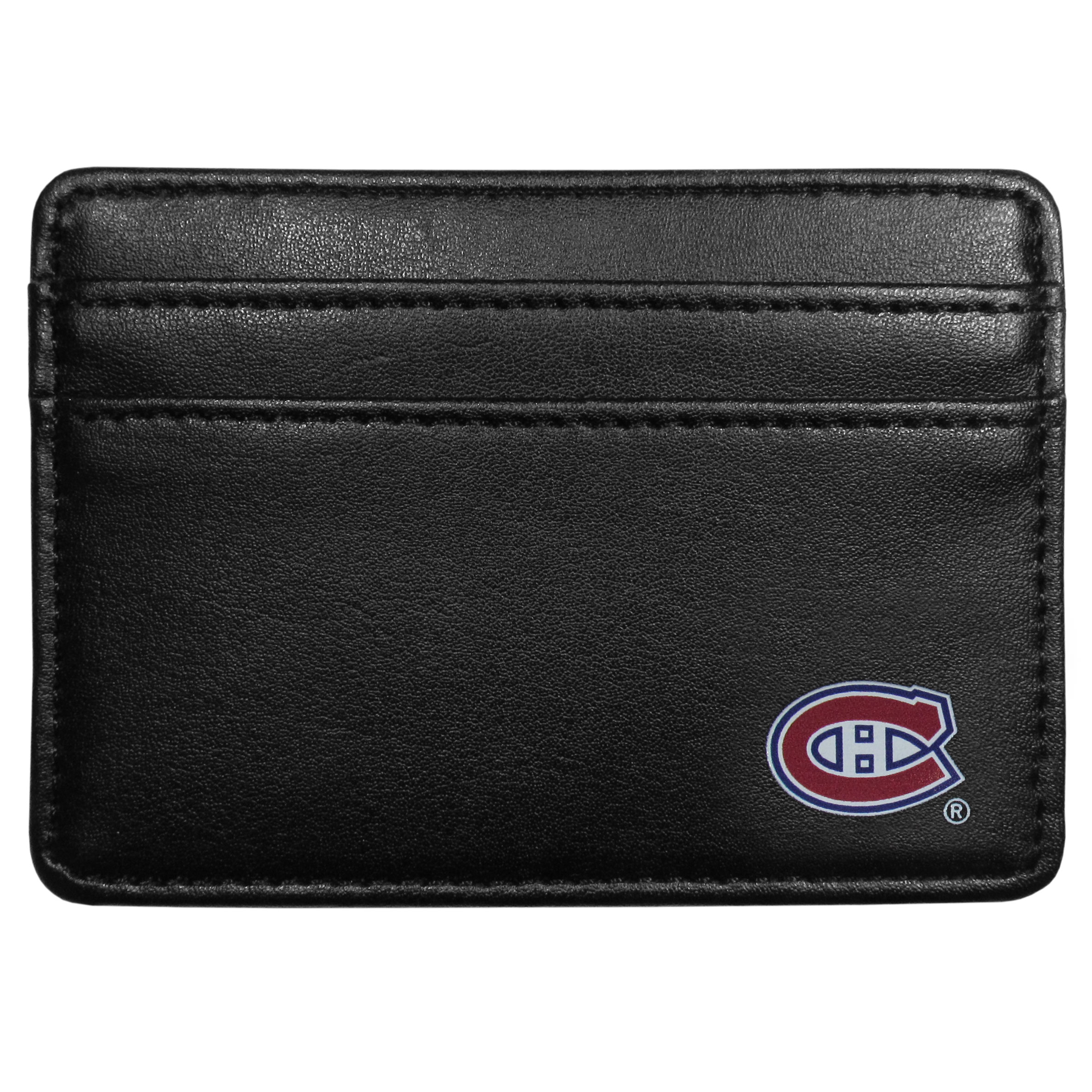 Ditch your bulky wallet! This super slim leather wallet is the perfect weekend companion and sports fan accessory. The compact design features 2 credit card slots on the front and one on the back and an inner middle pocket for cash. The front of the wallet has a crisp silk screened Montreal Canadiens® team logo. This front pocket wallet is just slightly larger than a credit card and super slim but with the inner pocket and outer slots it still can hold everything that you need.