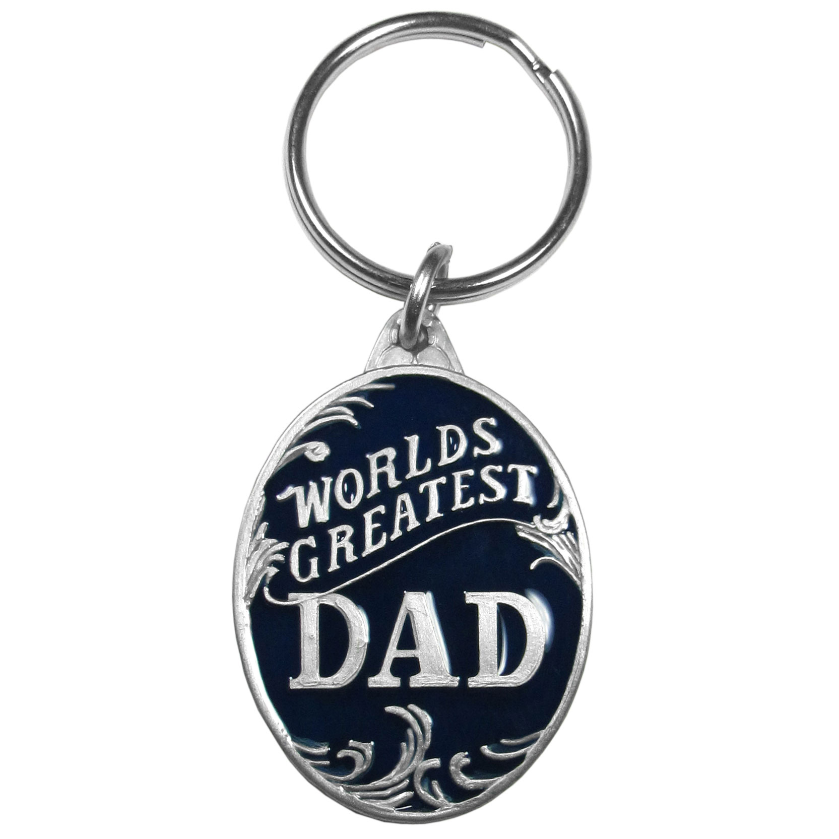 "World's Greatest Dad" key chain has a dark blue enamel background. Siskiyou's unique key chains are fully cast metal and are unequaled with the best craftsmanship. Key chain is 1-1/4" x 1-3/4".