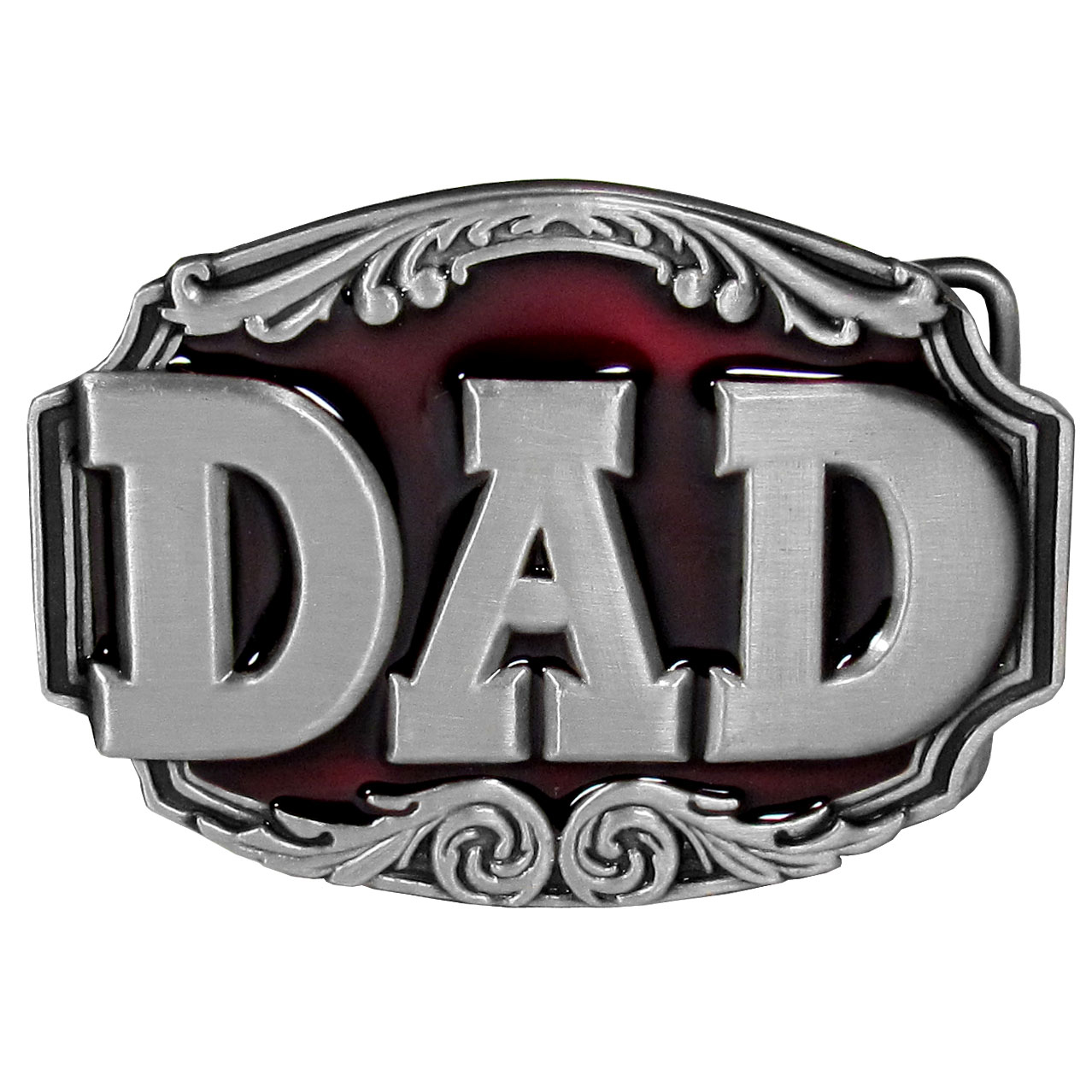 This belt buckle celebrates your love for dad.  "Dad" is written in bold with dark red enamel and design detail.  This exquisitely carved buckle is made of fully cast metal with a standard bale that fits up to 2" belts.